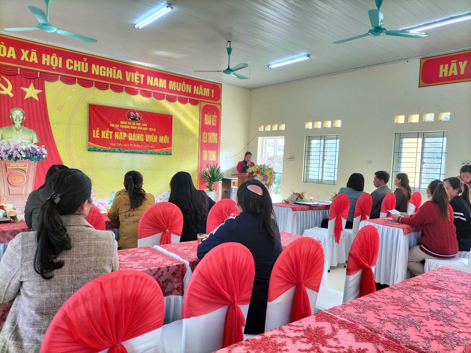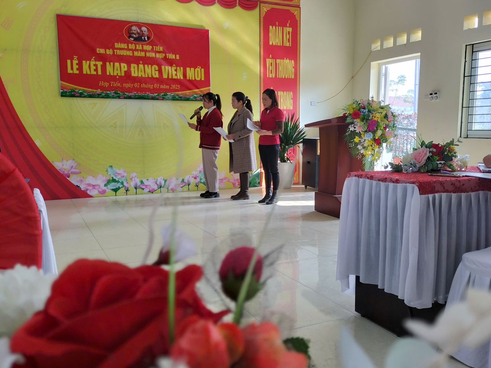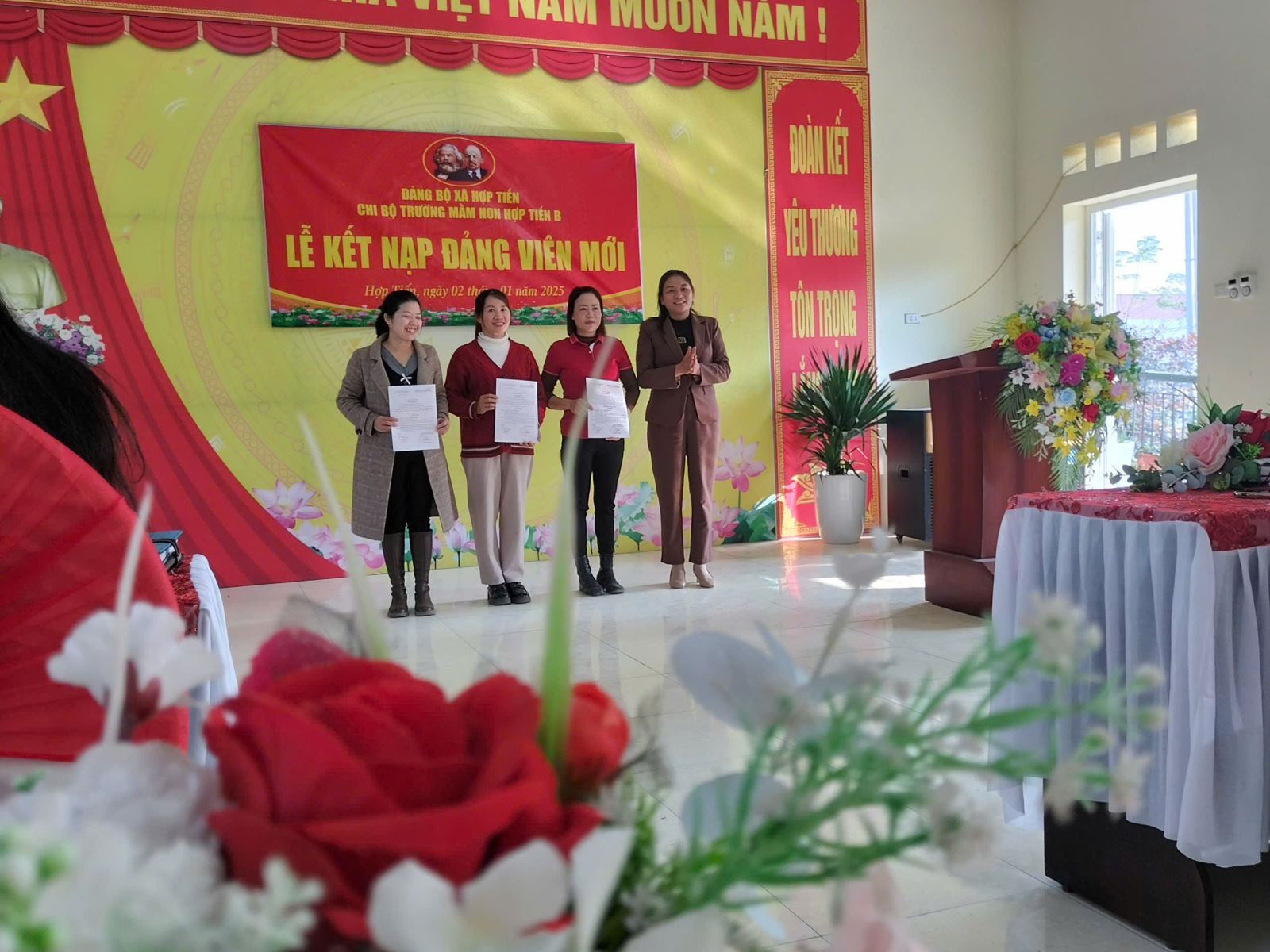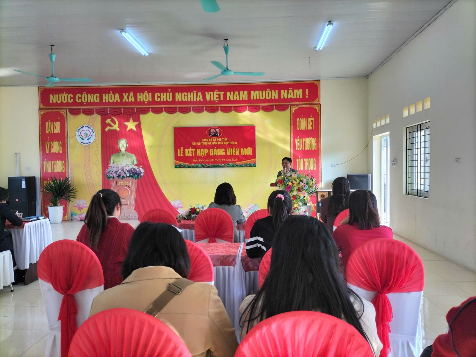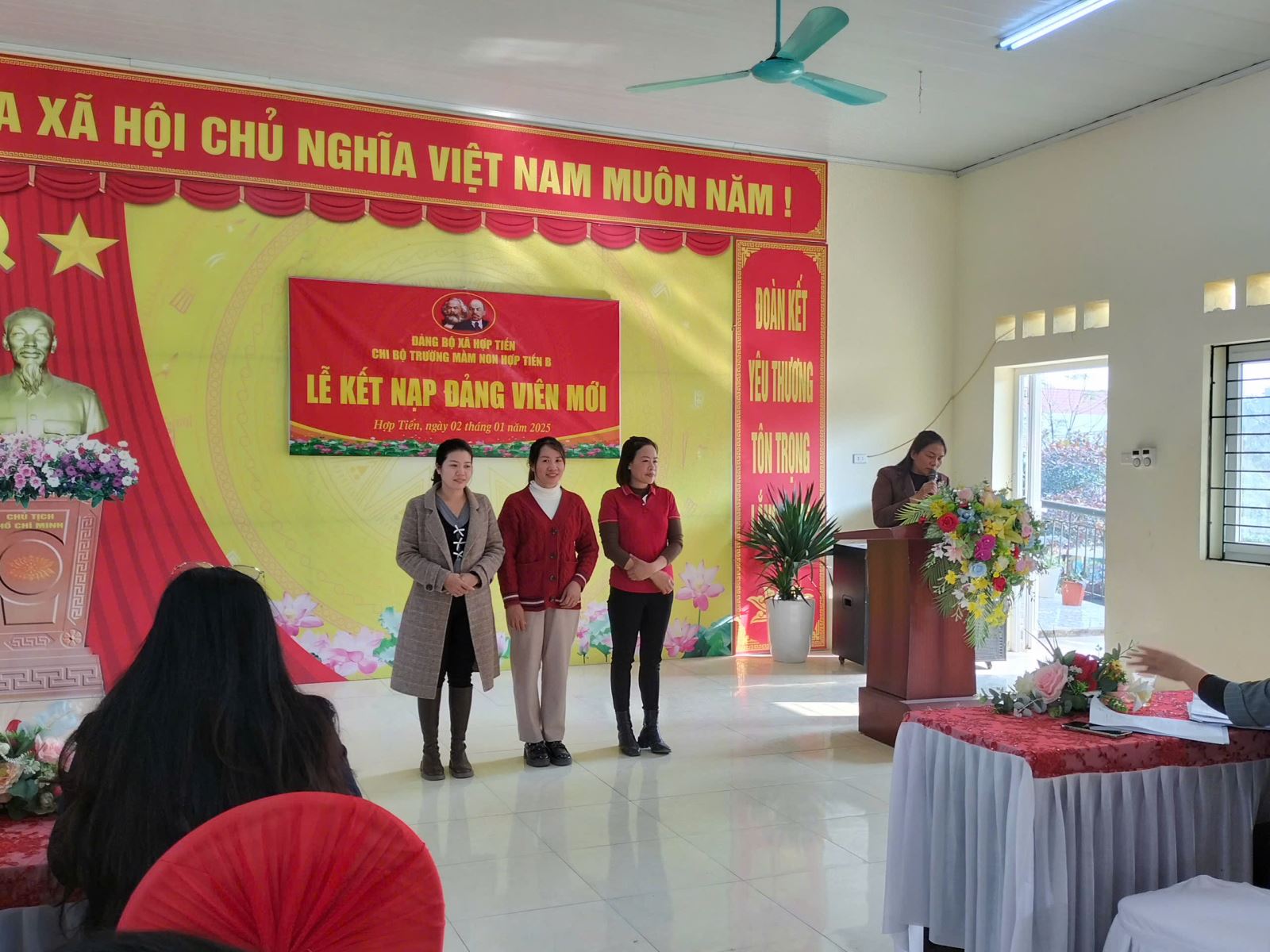 03/01/2025 A- A A+ | LỄ KẾT NẠP ĐẢNG VIÊN MỚI Xem Chia s? Thực hiện Nghị quyết Đại hội Chi bộ Trường Mầm Non Hợp Tiến B về việc phát triển Đảng viên. Ngày 2/1/2025, Chi bộ trường Trường Mầm Non Hợp Tiến B đã long trọng tổ chức lễ kết nạp Đảng viên mới đối với 3 quần chúng ưu tú. Đây là sự kiện có ý nghĩa quan trọng trong công tác xây dựng Đảng, góp phần phát triển, nâng cao chất lượng và sức chiến đấu của Chi bộ trường nói chung và các cá nhân Đảng viên nói riêng. Về dự với buổi lễ Lãnh đạo xã: ĐC: Nguyễn Văn Bãi- Phó Bí Thư đảng uỷ xã Hợp Tiến Lễ kết nạp diễn ra theo đúng trình tự, thủ tục điều lệ Đảng dưới sự chủ trì của đồng chí Trần Thị Trinh – Bí thư Chi bộ, Phó Hiệu trưởng nhà trường cùng tập thể Ban Chi ủy và đông đủ các đảng viên trong Chi bộ. Để vinh dự đứng trong hàng ngũ của Đảng, 3 Đồng chí Nguyễn Thị Nội, Trịnh Thị Thắm, Trần Thị Hơn dưới sự dìu dắt của nhà trường, chi bộ Đảng Trường Mầm Non Hợp Tiến B đã không ngừng phấn đấu, rèn luyện trong quá trình học tập, tu dưỡng đạo đức theo lý tưởng, tôn chỉ của Đảng Cộng sản Việt Nam, lấy tư tưởng Hồ Chí Minh làm kim chỉ nam cho mọi hành động. Là một Đảng viên mới, đồng chí càng ý thức rõ hơn về trách nhiệm của bản thân đối với gia đình, xã hội và Nhà trường. Đây là sự kiện dánh dấu một bước ngoặt đối với 3 ĐC đảng viên trẻ . Hình ảnh: Đc Trần Thị Trinh - Bí thư chi bộ lên trao quyết định cho 3 đc Trong không khí trang nghiêm khi nhận quyết định từ Bí thư Chi bộ, dưới cờ Đảng, cờ Tổ quốc và chân dung Chủ tịch Hồ Chí Minh cùng sự chứng kiến của Chi bộ, 3 đồng chí đã tuyên thệ lời thề của người đảng viên Đảng Cộng sản Việt Nam, hứa sẽ tiếp tục phấn đấu để luôn xứng đáng là người đảng viên gương mẫu, hoàn thành tốt mọi nhiệm vụ dược giao, góp phần xây dựng Chi bộ ngày càng vững mạnh. Hình ảnh : 3 đồng chí đọc lời tuyên thệ Phát biểu tại Lễ kết nạp Đảng viên Đồng chí Trần Thị Trinh –Bí thư Chi bộ đã phân công nhiệm vụ cho đảng viên mới và chúc mừng 3 đồng chí, sau một thời gian được bồi dưỡng, thử thách đã được vinh dự đứng trong hàng ngũ của Đảng Cộng sản Việt Nam. Hình ảnh : ĐC Trần Thị Trinh lên phát biểu và giao nhiệm vụ cho 3 đc đảng viên mới Hình ảnh: ĐC Nguyễn Văn Bái- Phó bi thư đảng uỷ xã Hợp Tiên lên phát biểu và chị đạo Bồi dưỡng, kết nạp đảng viên mới là nhiệm vụ thường xuyên được Chi bộ Trường Mầm Non Hợp Tiến B rất quan tâm. Việc giáo viên trẻ được kết nạp vào đã khẳng định sự cố gắng trong học tập, tu dưỡng, rèn luyện của các đồng chí . Đây chính là những tấm gương sáng để các giáo viên trẻ tiếp theo của Trường Mầm Non Hợp Tiến B noi theo. Buổi lễ kết nạp đảng viên đã diễn ra thành công tốt đẹp. Việc kết nạp đồng chí đảng viên góp phần thưc hiện tốt Nghị quyết Trung ương 4 (khóa XIII) của Chi bộ Trường Mầm Non Hợp Tiến B và Chi bộ Trường Mầm NoN Hợp Tiến B quyết tâm phấn đấu đạt danh hiệu Chi bộ “Hoàn thành xuất sắc nhiệm vụ” năm 2025. Tập tin đính kèm Tải về
